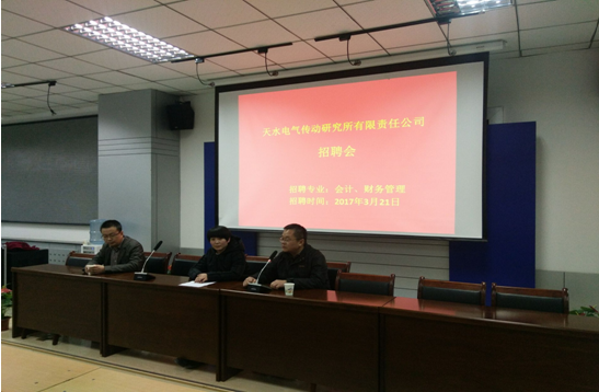 首先,天水电气传动研究所有限责任公司财务总监宣讲企业文化,筛选简历,确定面试人员,组织面试,最后确定录用人员。公司4名同学被录用。天水电气传动研究所有限责任公司校园招聘工作取得了圆满成功。