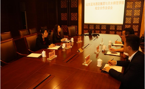 山东蓝海酒店集团人力资源管理部副部长首先介绍山东蓝海御华大饭店业务及发展情况,王金霞书记也对公司情况作了简单介绍并就公司与山东蓝海御华大饭店能够合作表示感谢,通过合作能够为公司酒店管理员工提供实训平台,另外就未来合作谈了具体意见及建议,希望公司和酒店能够长期合作,尽快签订合作协议。