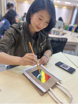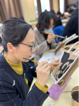 活动伊始,专业老师简单讲述了制作过程,大家就在帆布袋上进行手绘创意。用铅笔简单画好图案轮廓后,兴致勃勃地给画稿上色。瞧,我们的老师多认真多专注呀,大家创意十足,把五彩斑斓的色彩绘制在帆布袋上,用画笔描绘着自己的内心世界。