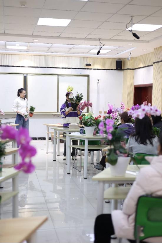 活动现场花香四溢,欢声笑语不断。大家或专注于自己的创作,或与邻座交流心得,在修剪枝叶间感悟取舍的智慧,在构图搭配中体验艺术的韵律。一盆盆原本清雅的蝴蝶兰,在老师们的巧思下,变成了错落有致、意境各异的盆景艺术品,或端庄秀丽,或灵动飘逸,充分展现了新时代女性内心的细腻与对美好生活的向往。